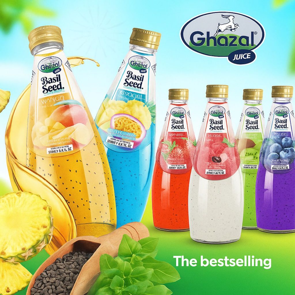 Refreshingly unique and bursting with flavor, Ghazal Basil Seed Drinks (290ml) are a delicious fusion of juicy fruit and healthy basil seeds. Each bottle is filled with vibrant colors and irresistible taste—choose from Mango, Cocktail, Strawberry, Lychee, Kiwi, or Blueberry. The chewy basil seeds add a fun twist to every sip, making it both refreshing and satisfying. Perfectly chilled, it’s the ultimate tropical refreshment in a bottle.