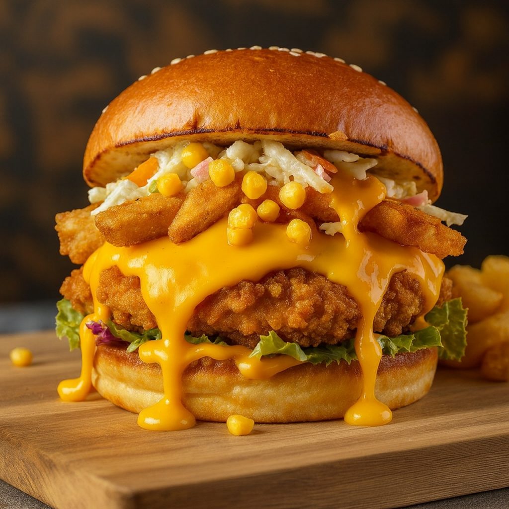 Take a bite into our Habibi Chicken Breast Burger for a flavorful adventure! A perfectly fried chicken breast is nestled in a soft bun, complemented by fresh coleslaw, crispy fries, tangy pickles, and sweet corn. Topped with creamy garlic sauce and our signature Crusty’s sauce, every bite is a deliciously satisfying explosion of textures and flavors!