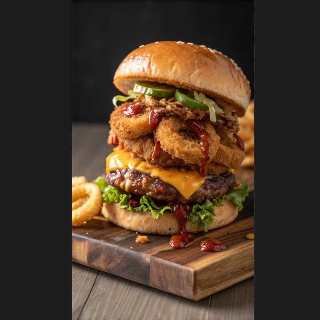 Get ready for the ultimate bite! The Crusty’s Monster Burger layers a juicy smashed beef patty, crispy fried chicken breast, crunchy onion rings, gooey cheddar cheese, fresh lettuce, spicy jalapeños, smoky BBQ sauce, and creamy Crusty’s sauce—all packed in a toasted bun. It’s a flavor-packed beast!