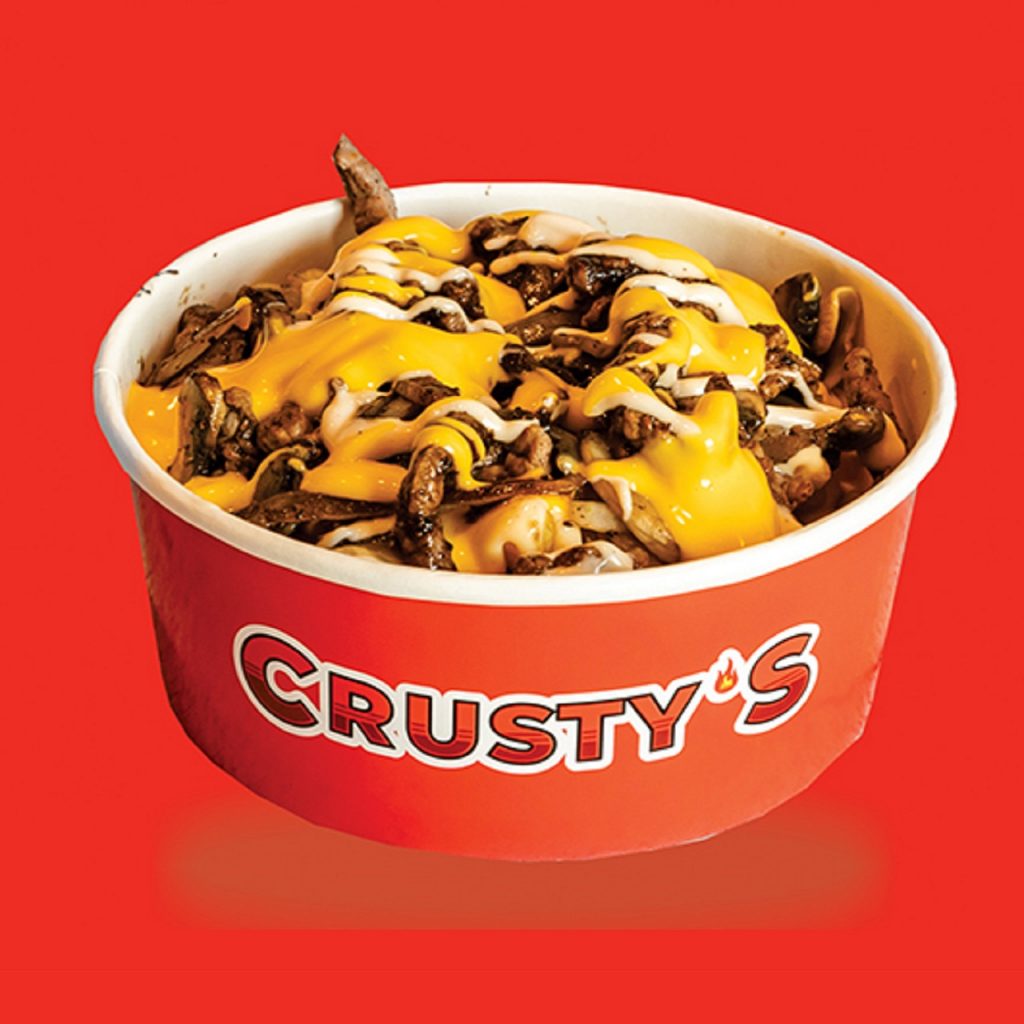 Indulge in the ultimate comfort food with our Beef Smash Box! Juicy, fresh Angus beefsteak is perfectly seasoned and paired with golden French fries, then topped with sweet caramelized onions, savory mushrooms, and a generous drizzle of Crusty’s signature sauce. Finished with creamy cheddar cheese sauce, this dish is a mouthwatering explosion of flavors and textures, crafted to satisfy every craving!